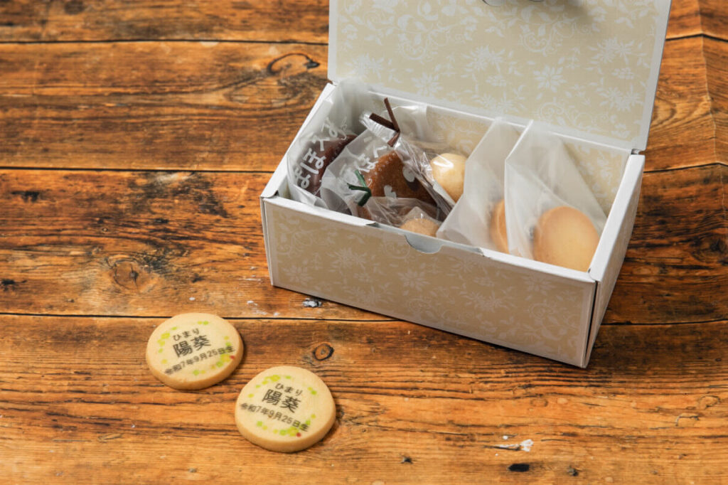 赤ちゃんのお名前入りクッキーが入った焼き菓子の詰め合わせは、出産内祝いにぴったりの贈り物。